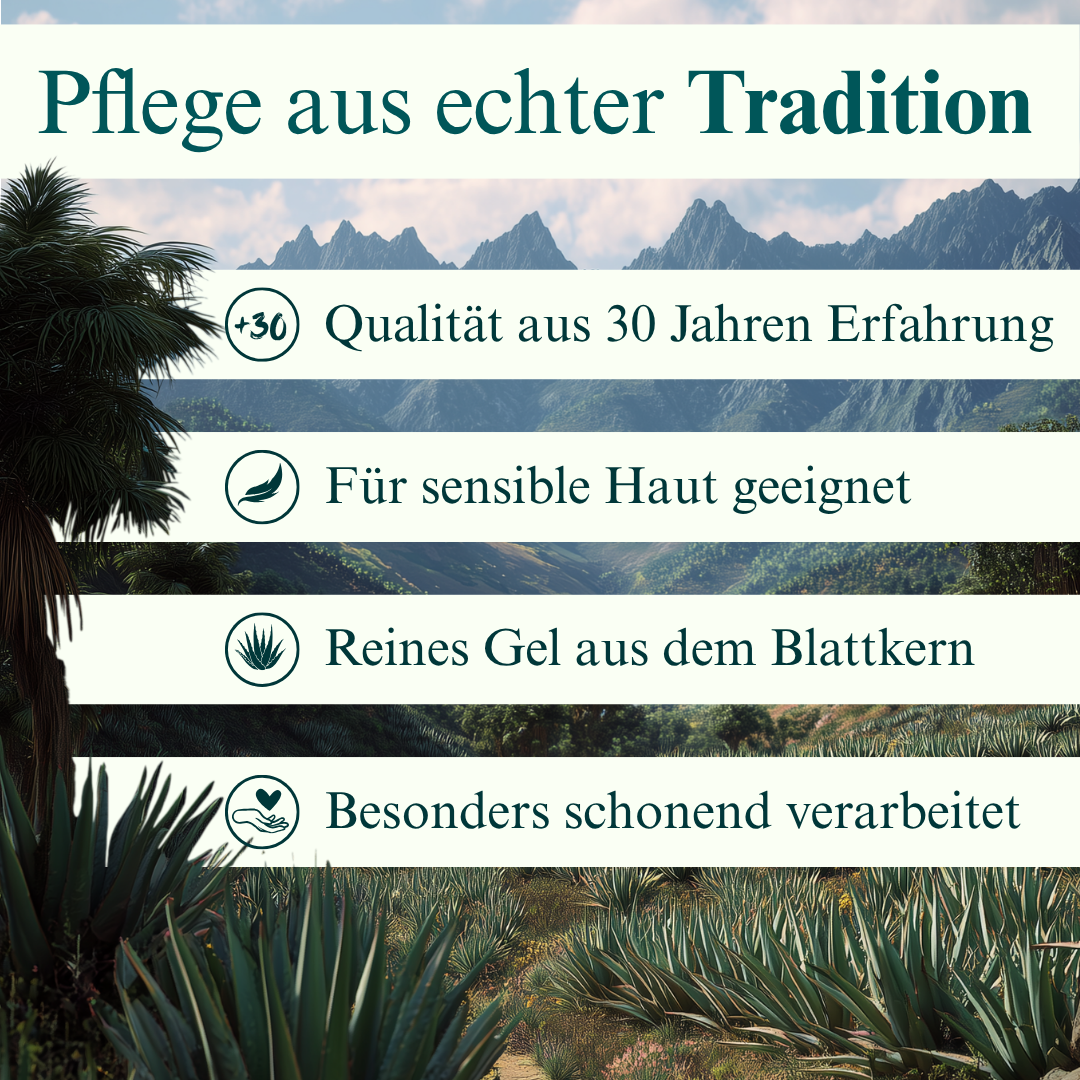 Aloe Vera ist ein wahres Wunder der Natur. Diese robuste Pflanze speichert in ihren fleischigen Blättern wertvolle Feuchtigkeit und konzentriert dabei über 200 natürliche Wirkstoffe - darunter Vitamine, Mineralien und wertvolle Polysaccharide. Erst nach 3-5 Jahren Reifezeit haben die Blätter ihre volle Wirkstoffkonzentration erreicht und werden behutsam von Hand geerntet. Diese natürliche Konzentration macht Aloe Vera zu einem der wertvollsten Inhaltsstoffe für die Hautpflege.